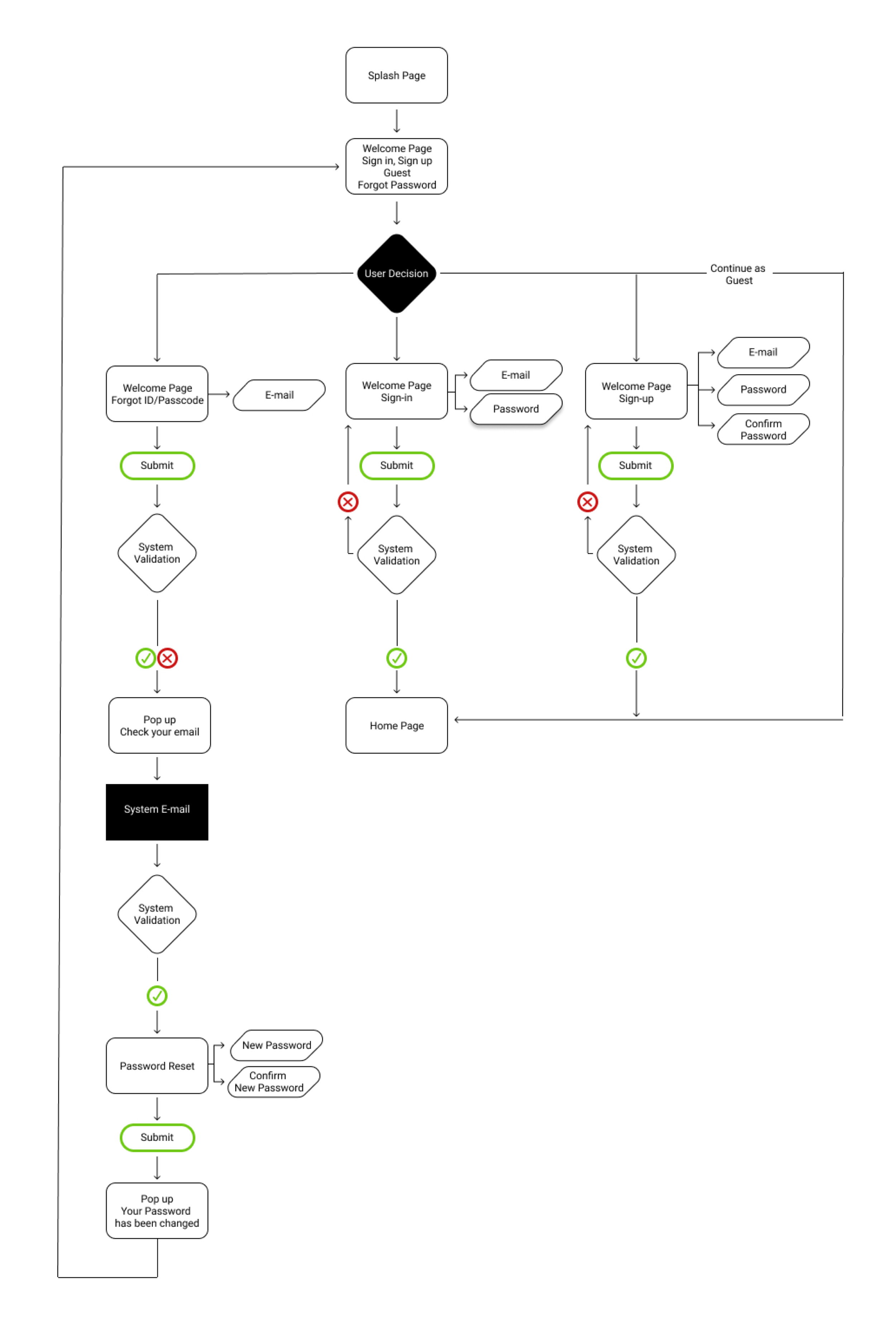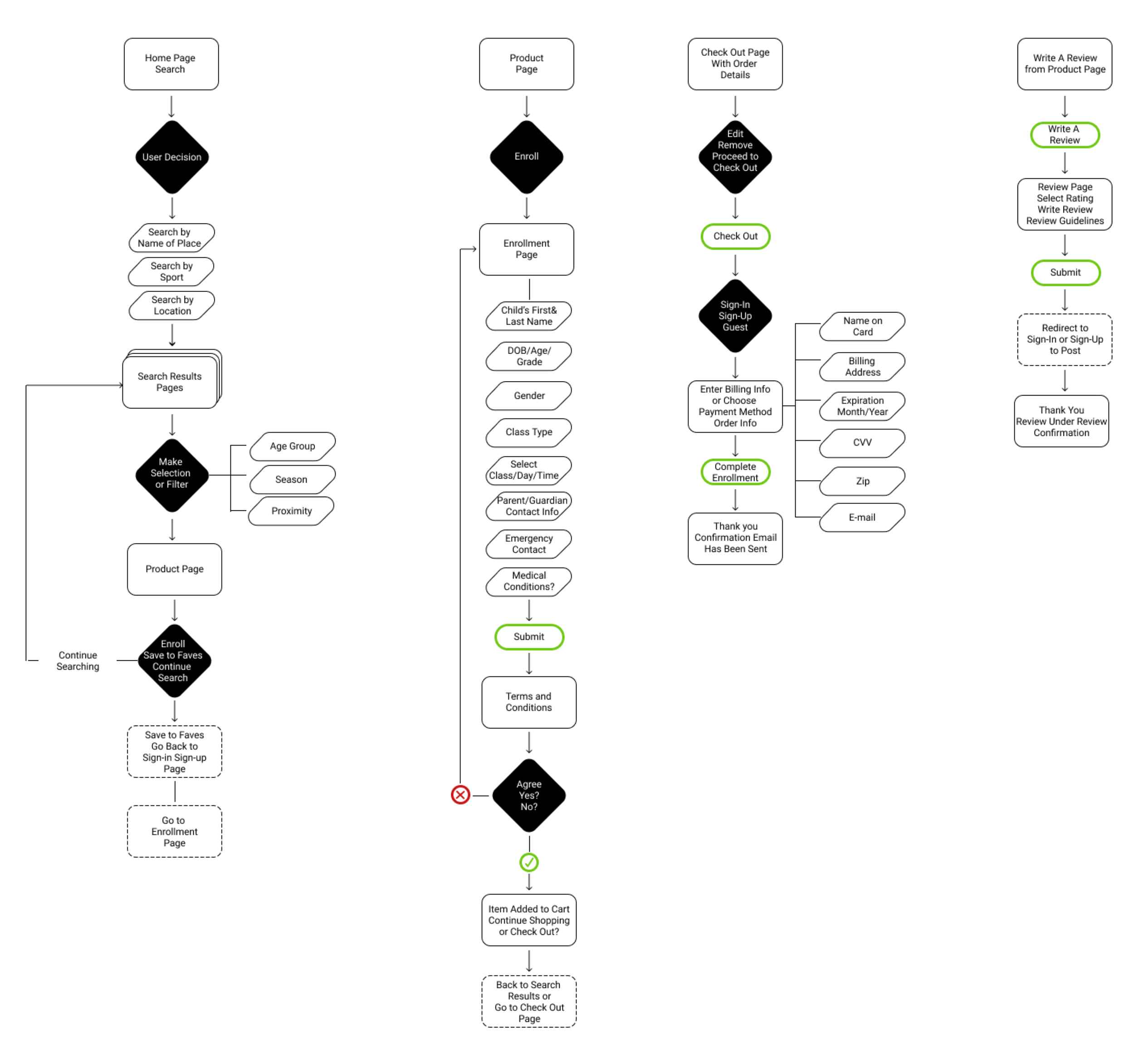 When it came to user flows, I identified four main routes that a user could potentially take. As part of the flows, I wanted to include an easy onboarding and a guest checkout option. I was careful to ensure the search process included a search by sport, location and venue.