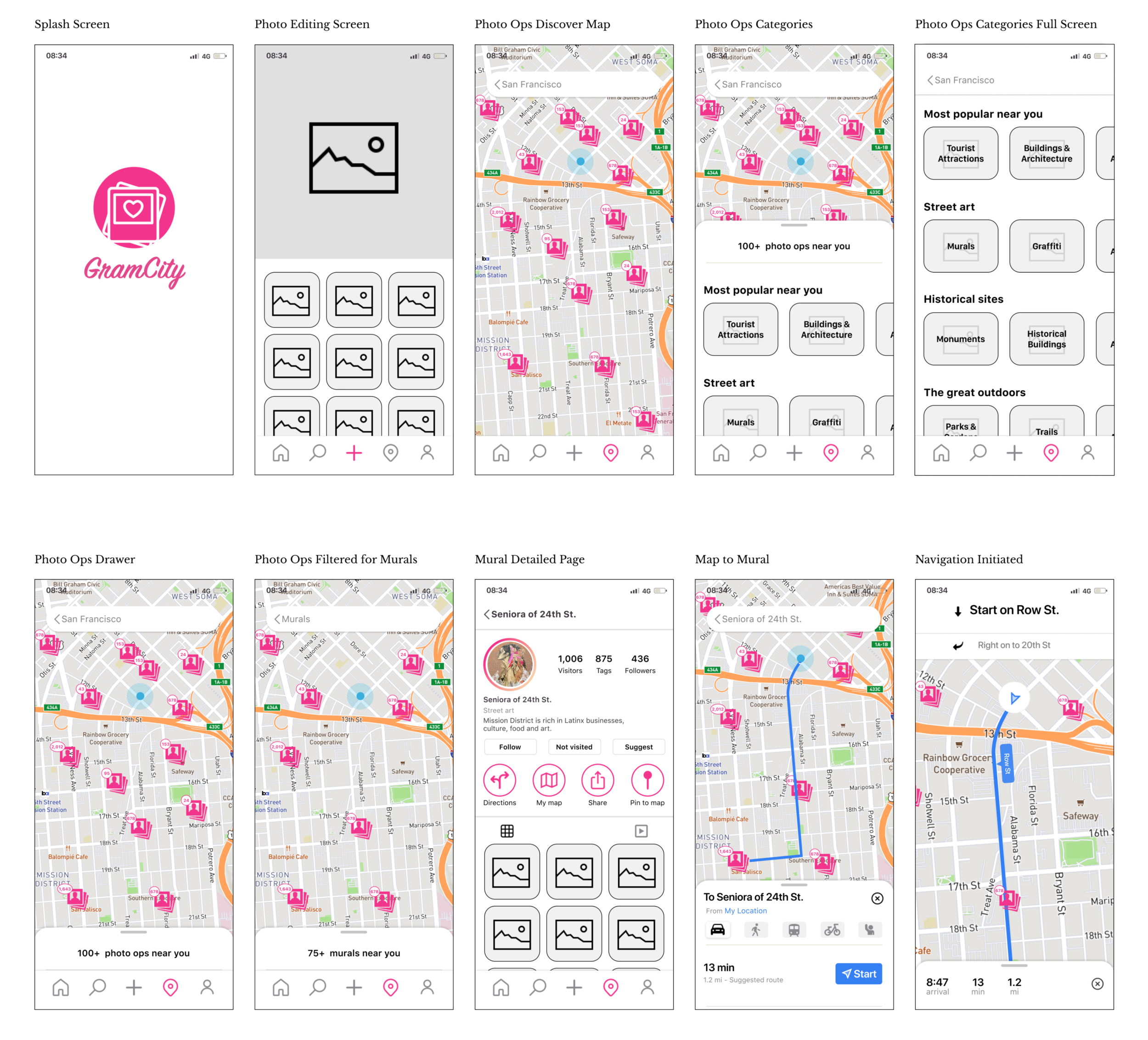 As I did in storyboarding, I kick off the prototype with the GramCity splash screen followed directly into the photo-editing feature. I wanted to make sure that as a new feature, the location based photo-op search was discoverable on the app.